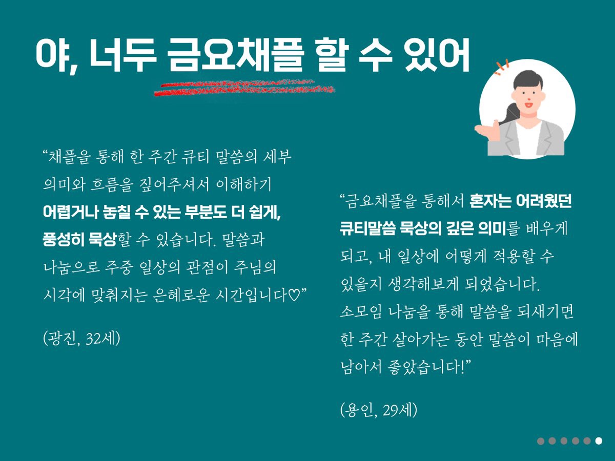 🌻한 주간 큐티 본문을 쭉~함께 리뷰하는 형식으로 메시지를 듣습니다.